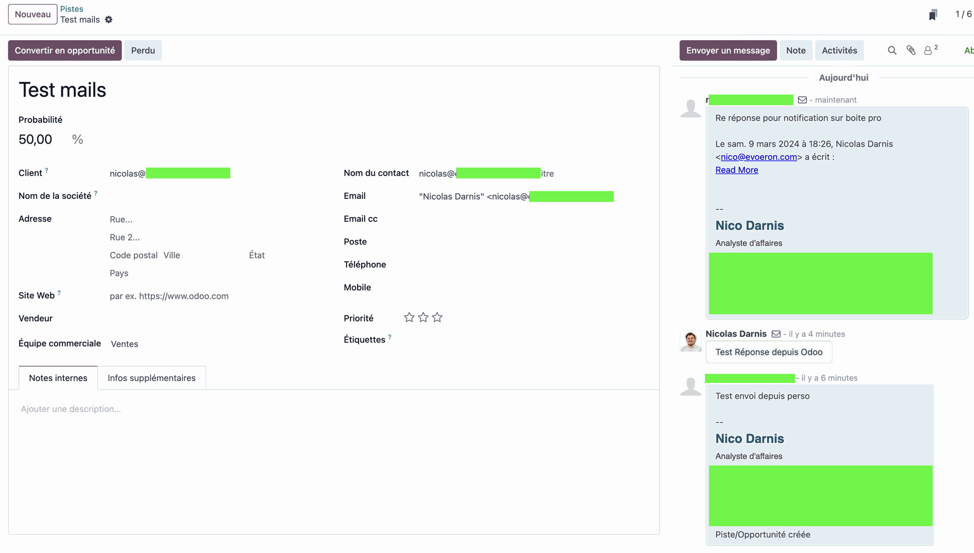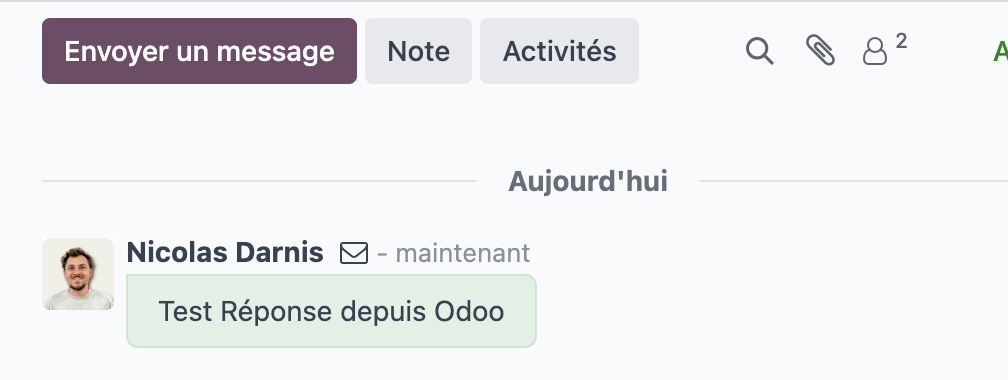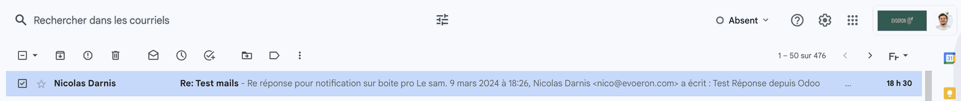 Enfin, répondez-y depuis votre mail perso et constatez la notification de réponse des abonnés dans votre mail pro ou votre Odoo.