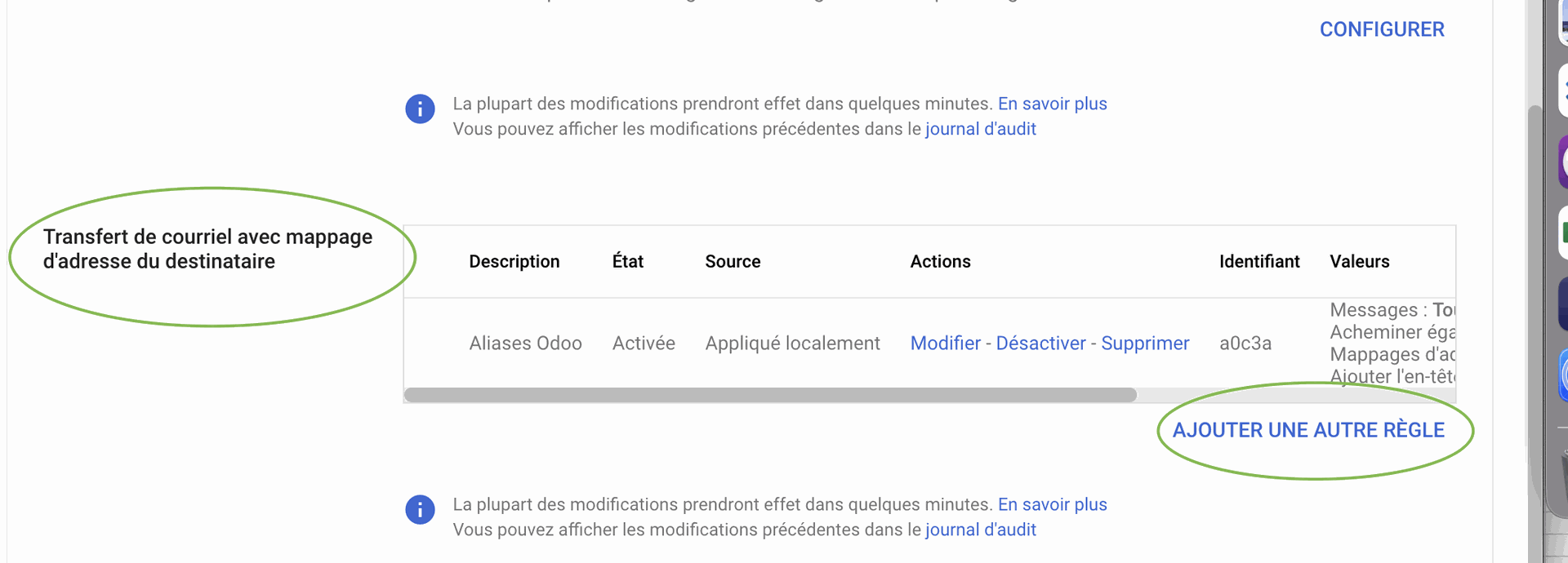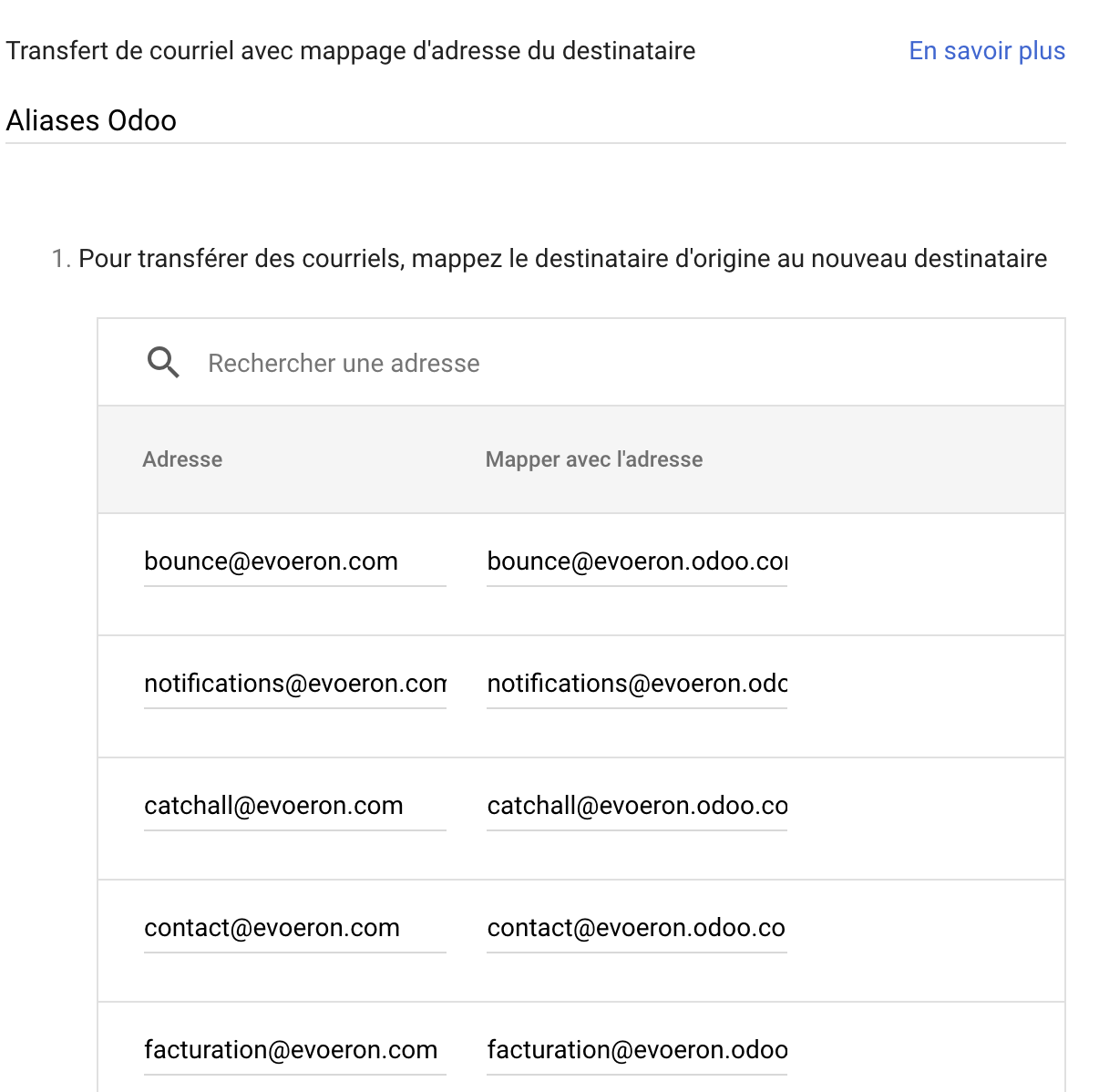 On doit rediriger les réponses vers Odoo. En effet, maintenant que l'alias d'envoi a été changé, Odoo envoi des emails avec votre nom et plus celui de la base. Donc la réponse retourne vers votre nom de domaine et non plus vers Odoo. Dans la suite, je prends comme exemple Google, mais faites avec votre interface de messagerie.