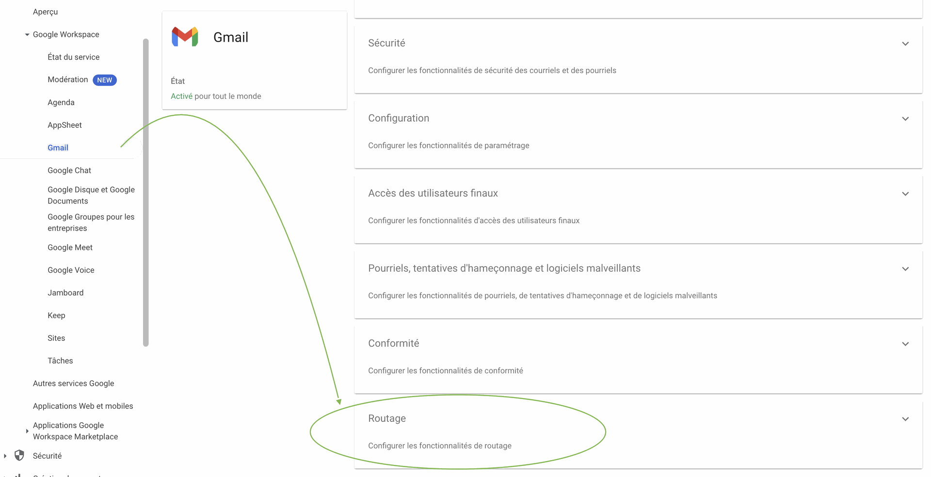Cherchez "Routage" dans les paramètres de votre Gmail.